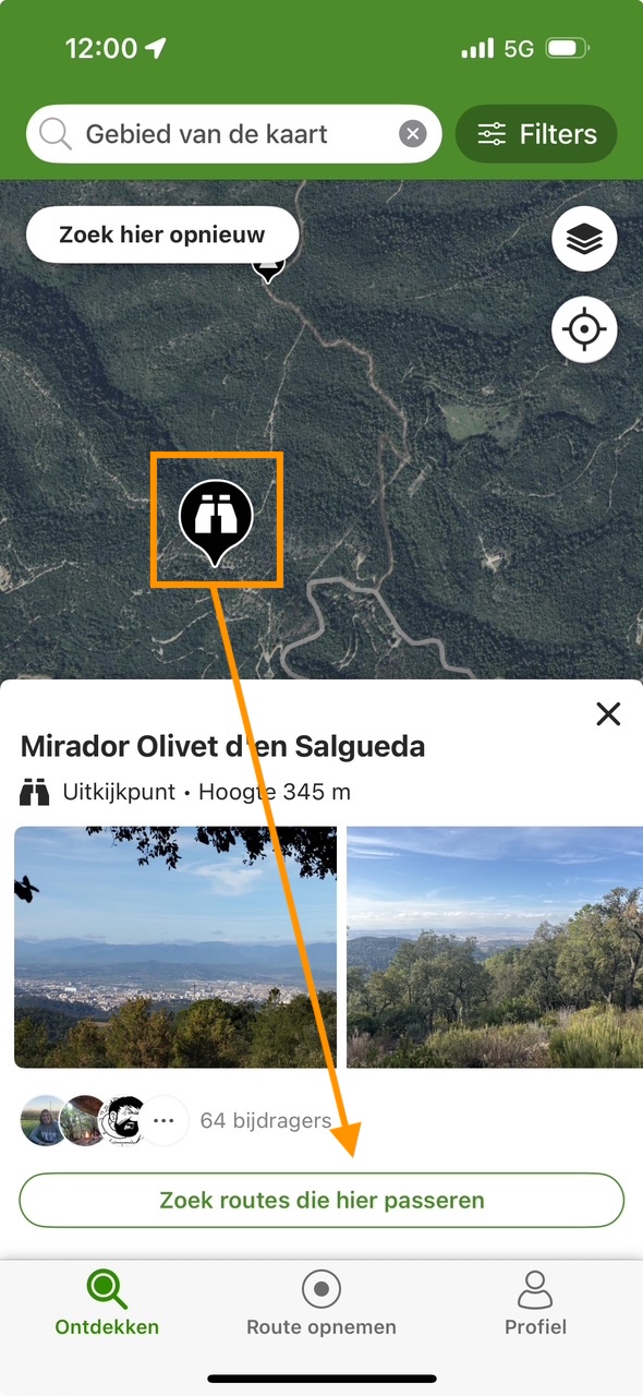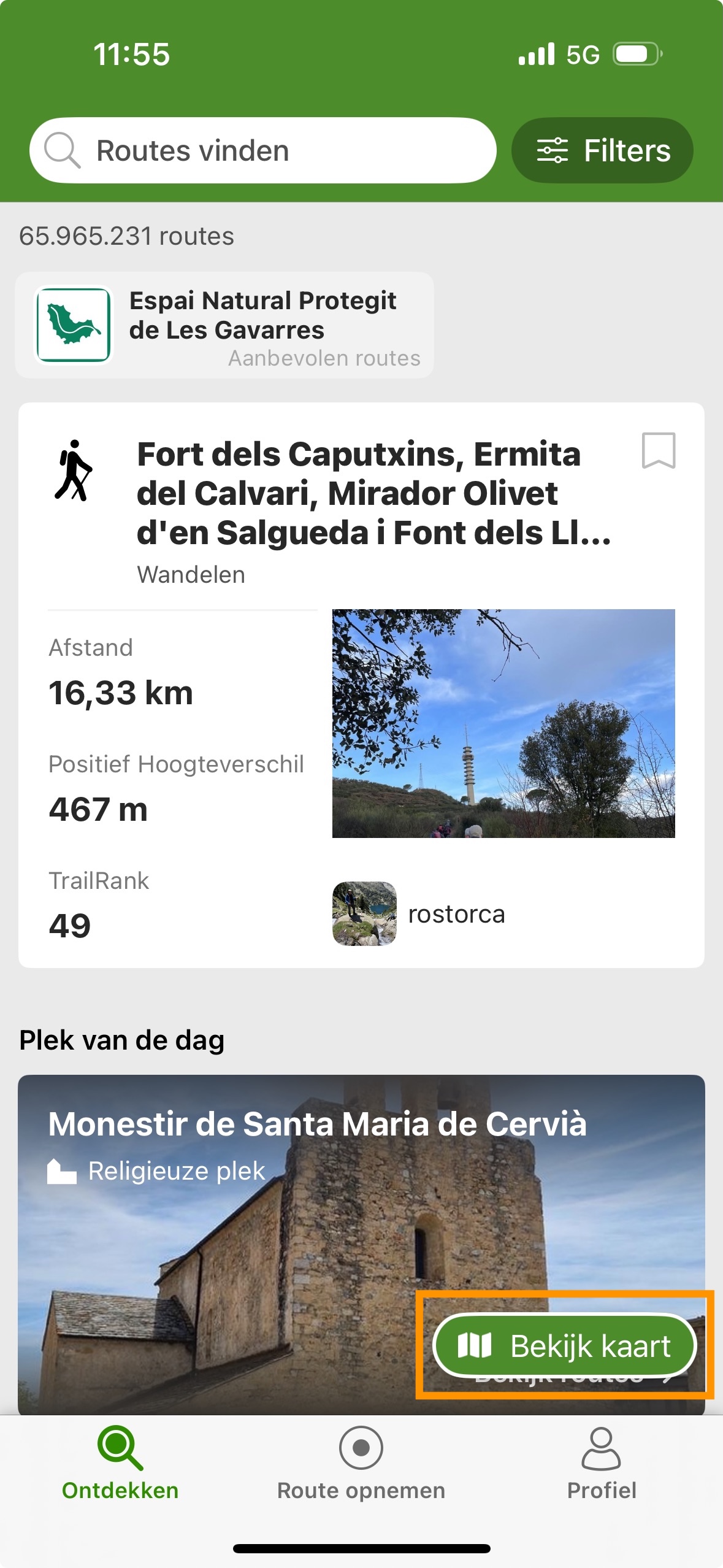 - Kaart openen: Als je op de knop Bekijk kaart tikt, verschijnt er een kaart met icoontjes van activiteiten op de startpunten van routes in dat gebied.