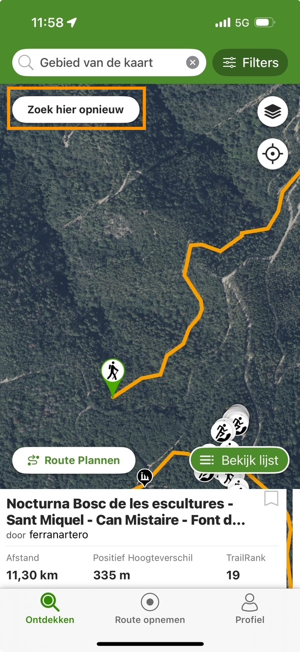 - Wil je gewoon je omgeving of andere plekken verkennen? Versleep dan de kaart met je vinger. Elke keer dat je de kaart verschuift, verandert het locatiefilter. Om de routes van de nieuwe locatie op de kaart te laden, tik op Zoek hier opnieuw.
