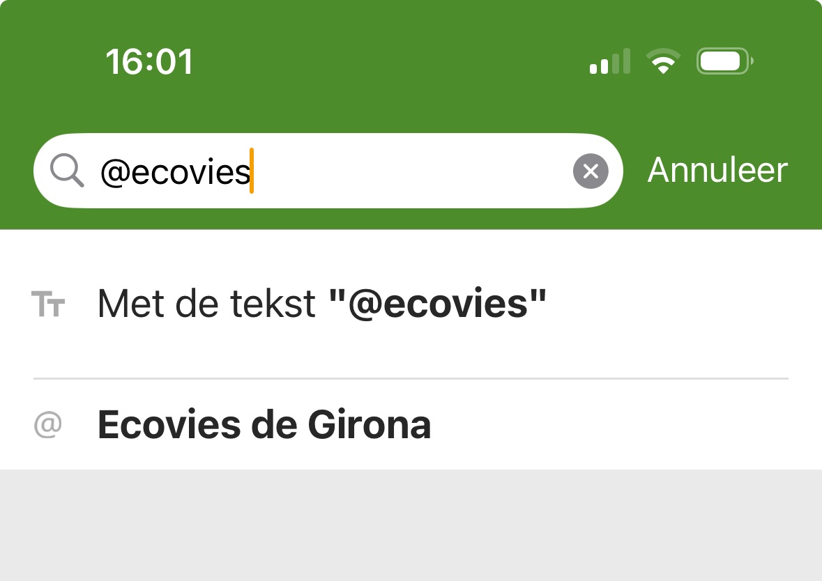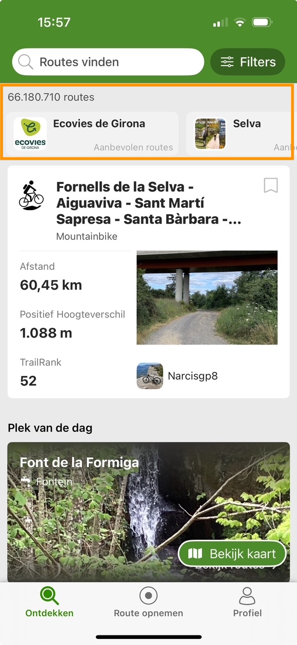 - Zoekfunctie in het tabblad Ontdekken: Als je de naam van het ORG-account weet, typ dan direct het symbool @ aan het begin van je zoekopdracht. Je krijgt dan een overzicht van al hun eigen routes én de routes die ze als favoriet hebben gemarkeerd.