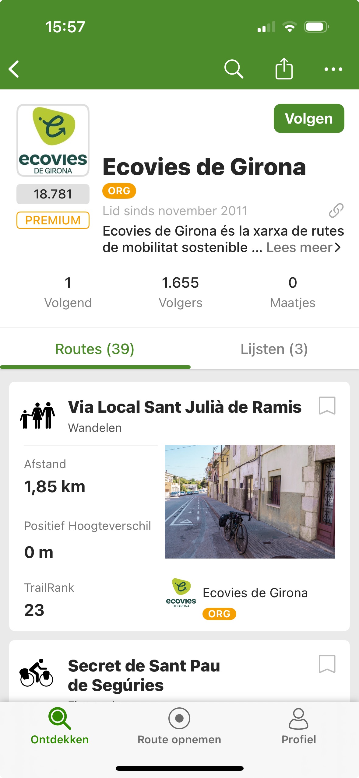 In de app kun je Wikiloc ORG-accounts op de volgende plekken bekijken: