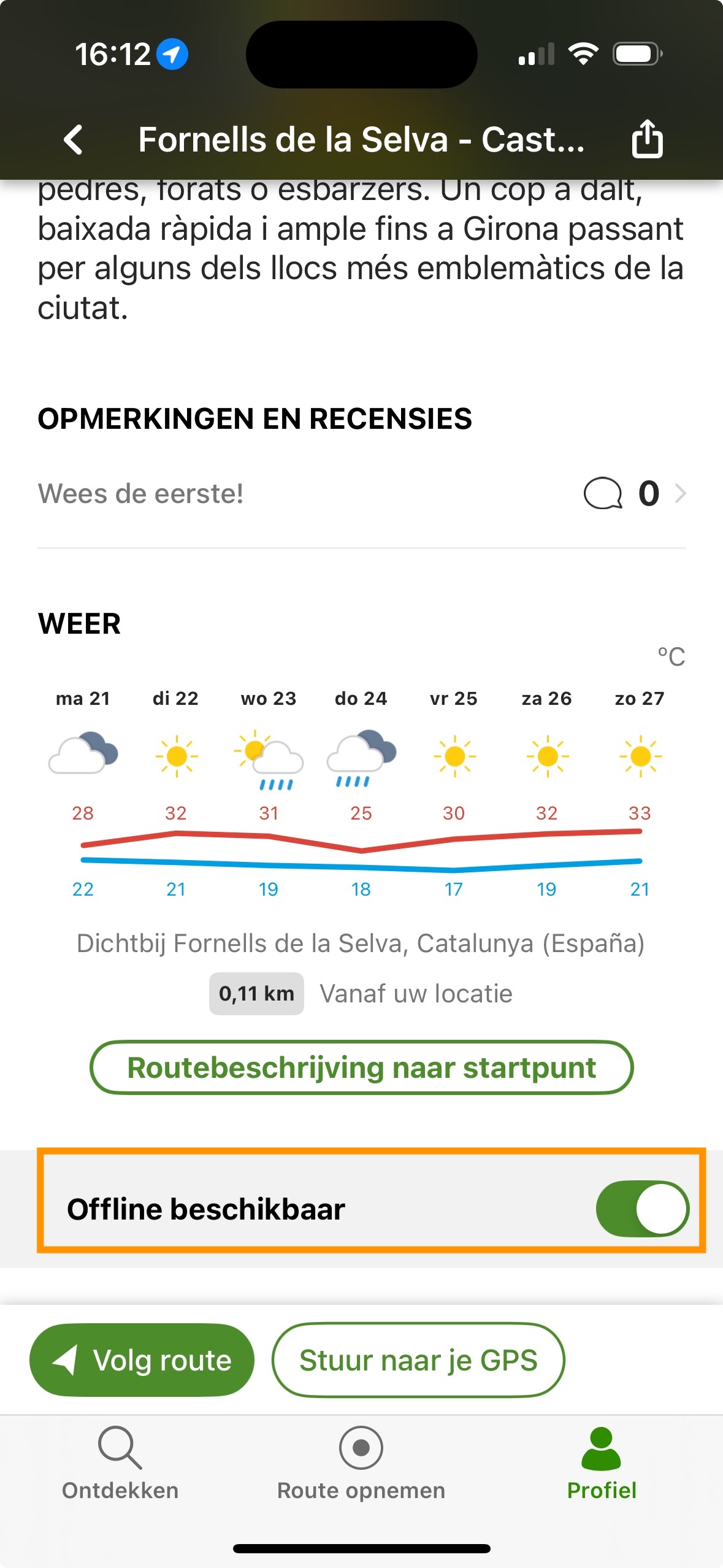 Je kunt routes markeren als Offline beschikbaar om ze te volgen zonder internetverbinding. Dit geldt zowel voor routes van andere gebruikers als voor je eigen routes.