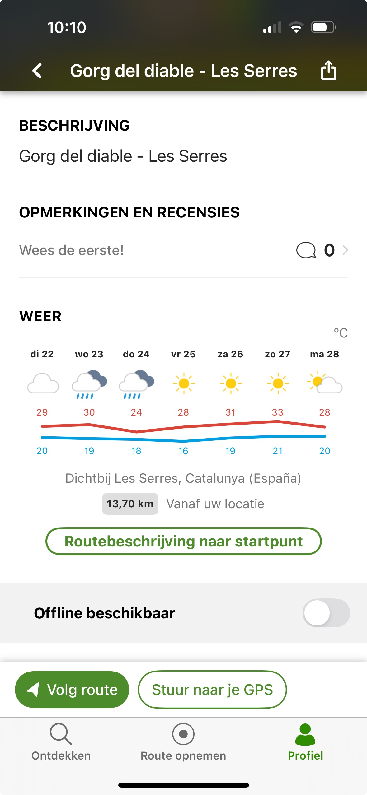 In de app kun je het weer bij elke route zien, direct onder de opmerkingensectie van de route.
