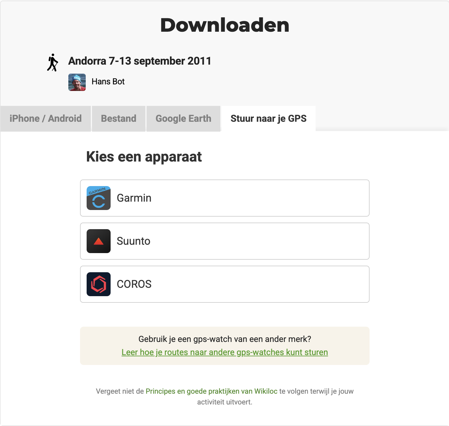 In de routepagina op de website zie je rechtsboven op het scherm de knop Downloaden met verschillende opties: