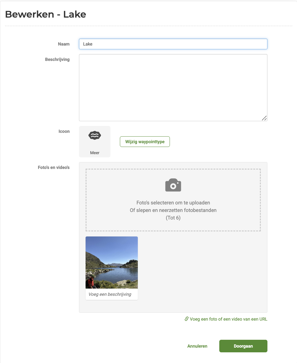 - Foto’s toevoegen (maximaal 6 per waypoint) of een foto vervangen