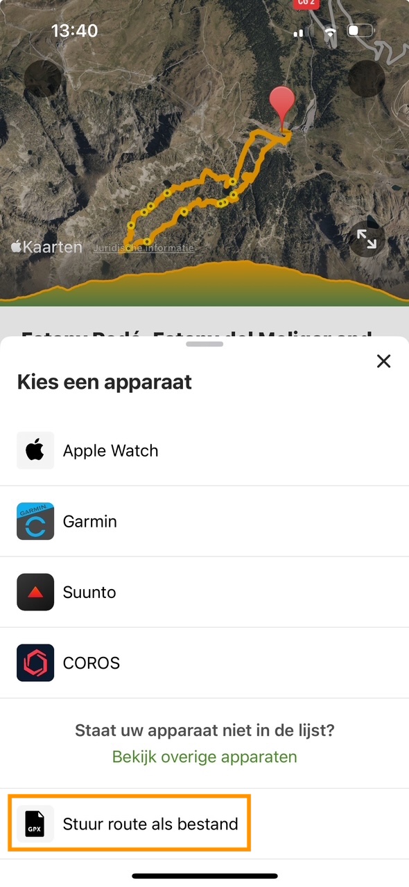 - De app zet de route automatisch om naar een standaardformaat dat de meeste apps kunnen lezen. Kies gewoon de app van het merk van je GPS. Als je die niet ziet, kijk dan bij de optie Meer.